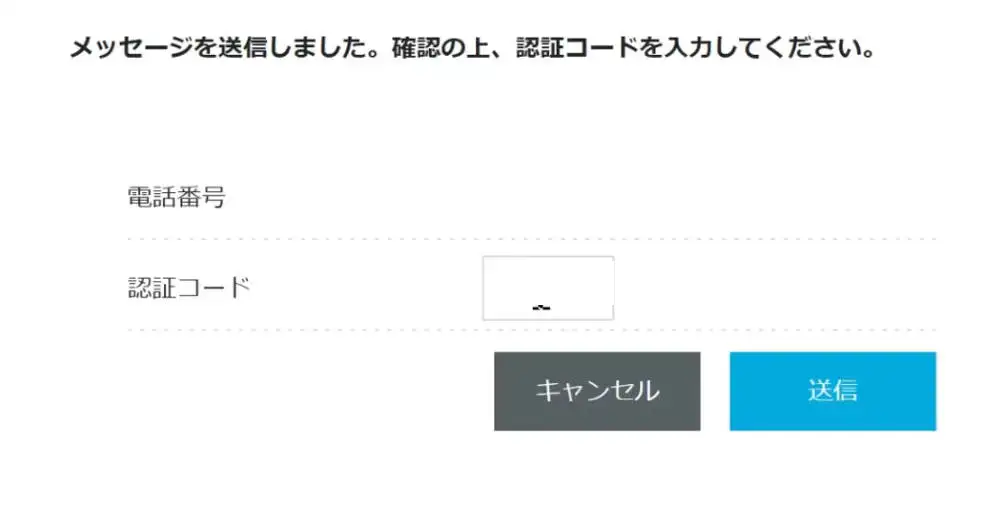お客様情報が入力し終えたら、SMSもしくは電話認証画面がでてきます。
