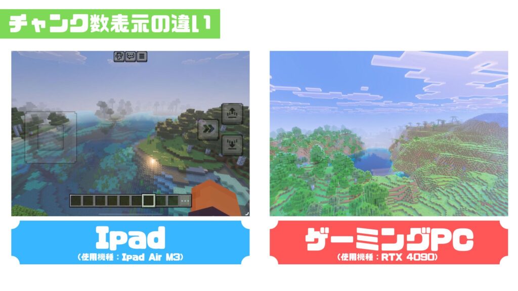 ただこれ明確にチャンク数の違いもあり、実際にIpad AirとゲーミングPCで見ても遠くまで表示される違いがあるということはおわかりでしょうか?