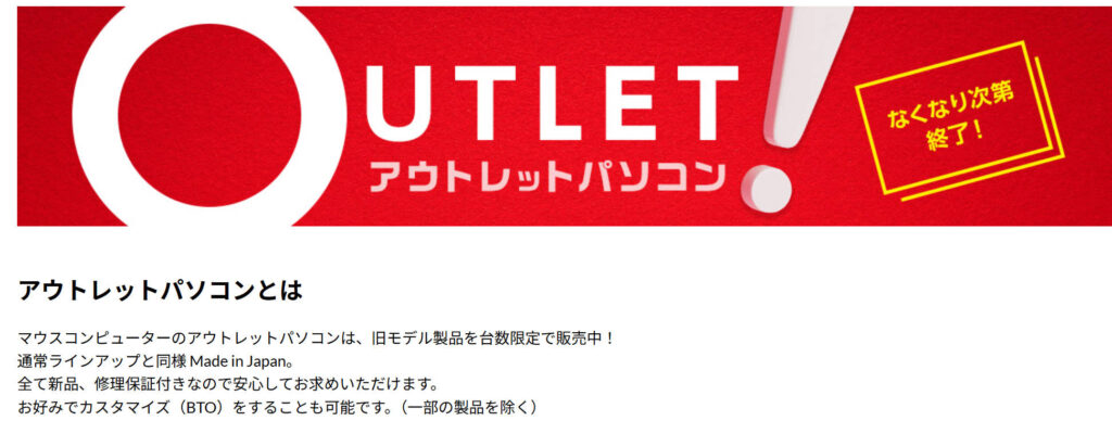マウスコンピューターのアウトレット・再生品モデルを狙うのも一つの手です。