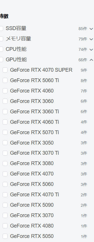 ラインナップのボリュームゾーンは、RTX 5060 Ti / RTX 4060 / RTX 4070 Super / RTX 5070 / RTX 5070 Ti あたりが多め。