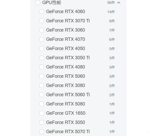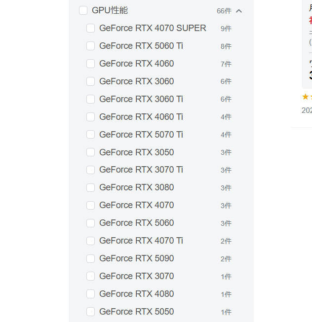 ノートはRTX 4060 Laptopが圧倒的に多く(14件以上)、次いでRTX 3070 TiやRTX 3060、RTX 4070やRTX 4050といった構成。